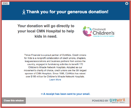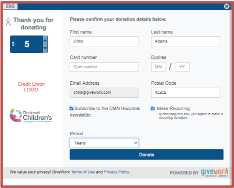 Give on the Go is a new online and mobile banking fundraising solution financial institutions can use to raise funds for their local children’s hospital. Created in partnership by Children’s Miracle Network Hospitals, Q2, and GiveWorx, this app allows a member to make a donation through the online banking portal. It is a convenient and user-friendly process, requiring two clicks to complete a donation.